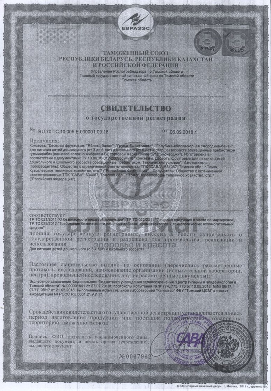 Десерт фруктовый Яблоко - Банан, обогащенный пребиотиком гуммиарабик, для питания детей старше 3 - х лет. Без сахара, консервантов и ароматизаторов.