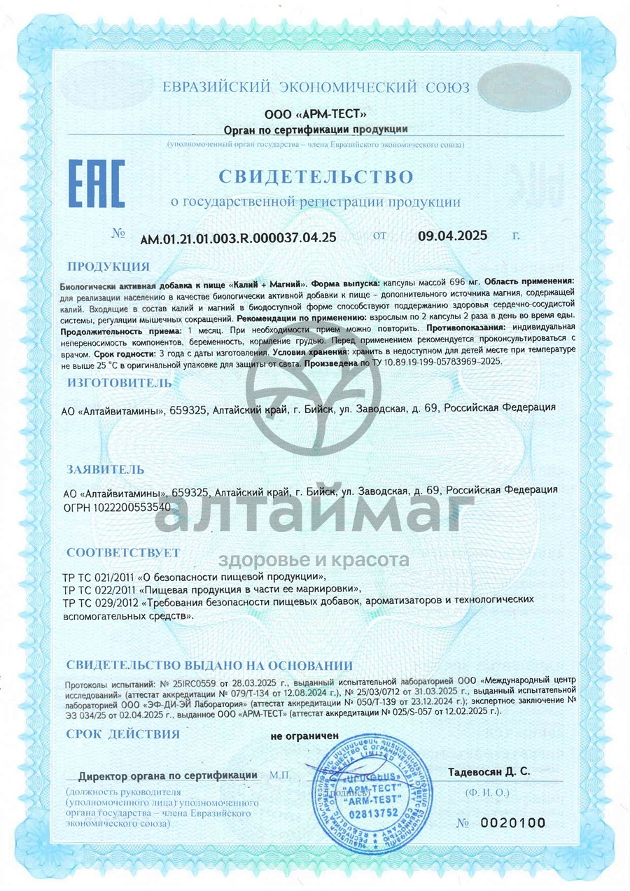 - Чтобы купить Калий + магний БАД Алтайвитамины 60 капсул совершите всего несколько шагов: укажите количество продукта и нажмите на кнопку «Купить».