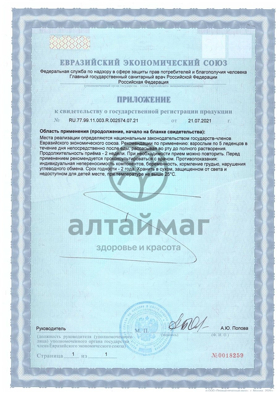 сахар, патока крахмальная, лимонная кислота (антиокислитель), экстракт шалфея лекарственного, экстракт липы сердцевидной, аскорбиновая кислота (витамин С – L-аскорбиновая кислота), краситель: медные комплексы хлорофиллинов, куркумин.Способ применения