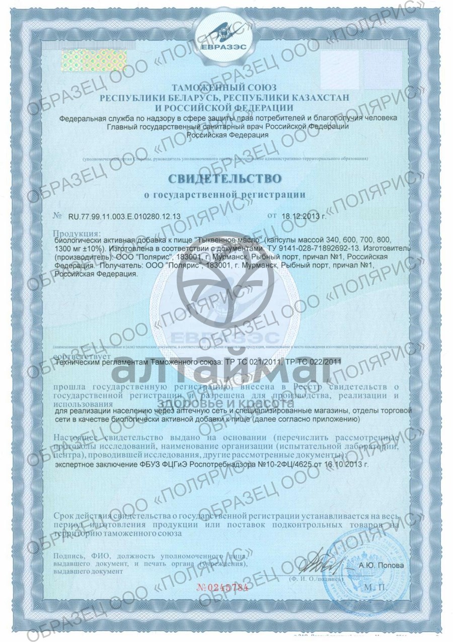 Тыквенное масло, оболочка (желатин, загуститель глицерин, вода), витамин Е.Способ применения